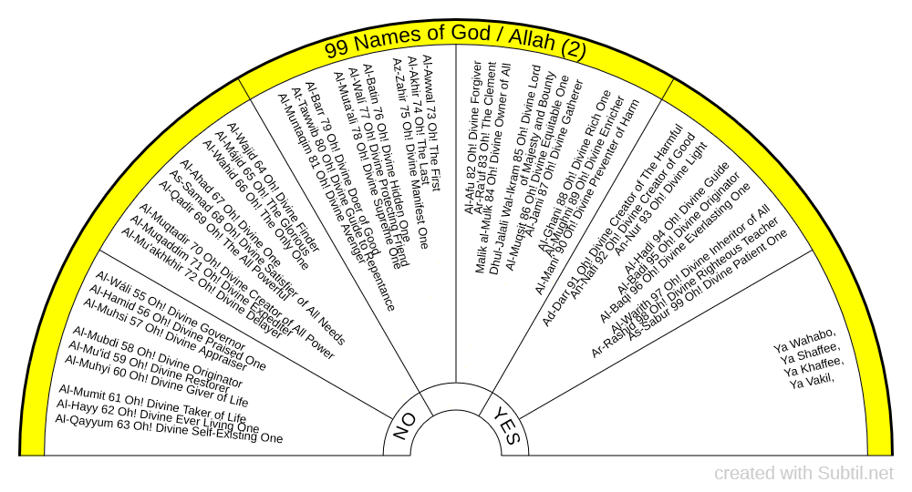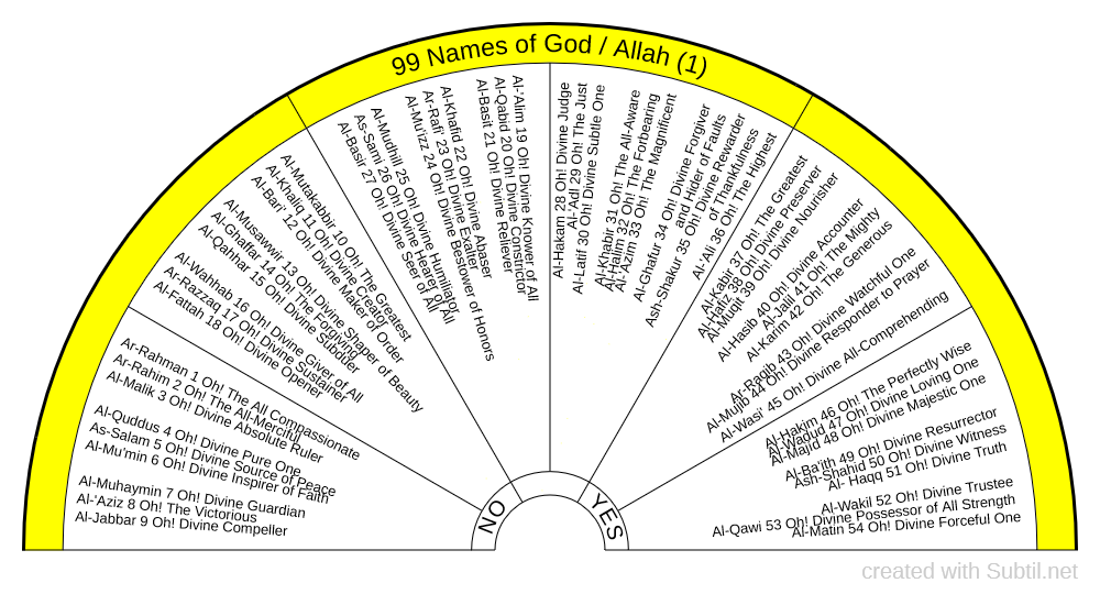 Turns out the 99 names of God represent each of the spiritual gifts. The most common ones, any ways.